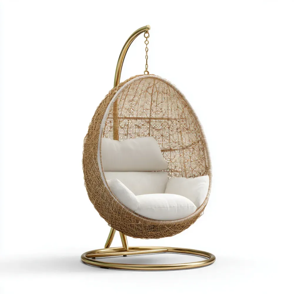 このエレガントなハンギングチェアは、ナチュラルなラタン素材を使用し、屋内外でリラックスできる完璧なスペースを提供します。