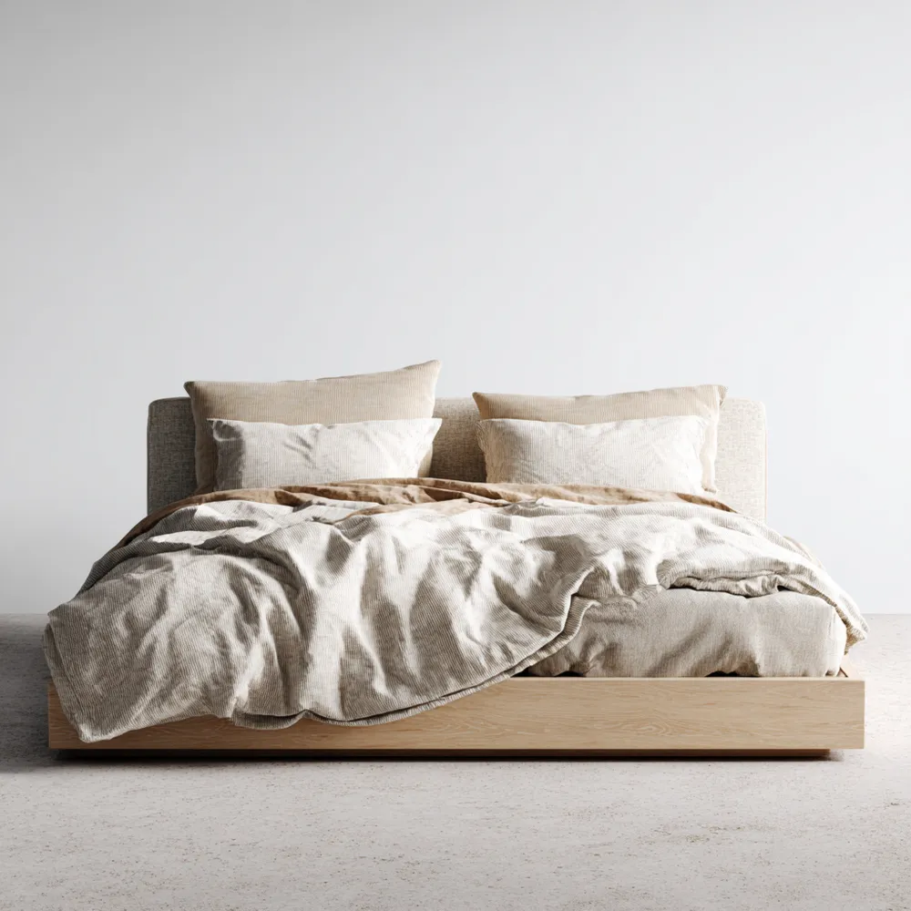 このモダンスタイルのダブルベッドは、シンプルでありながら洗練されたデザインが魅力です。木製フレームとベージュのリネン仕上げによって、どんな寝室にも調和します。